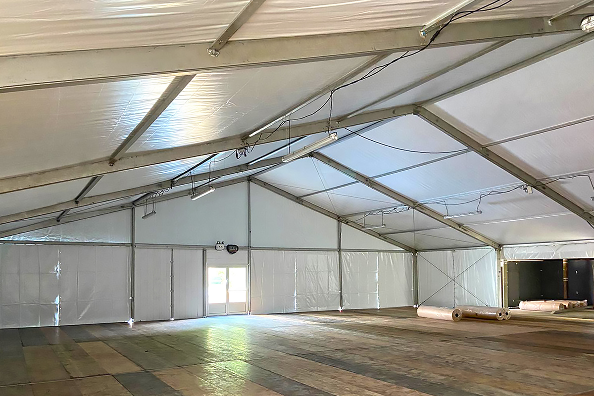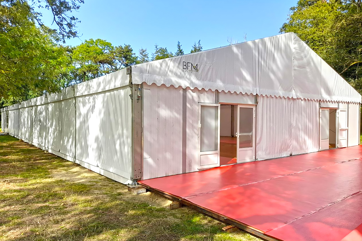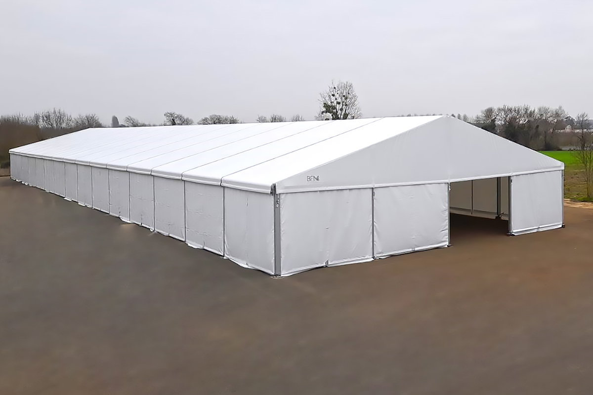 - ■ Surface éphémère possible de 25 m² à 3000 m² : Entièrement modulable, l'accès à la structure peut se faire par portail sectionnel ou électrique, porte avec barre anti-panique et/ou porte vitrée.