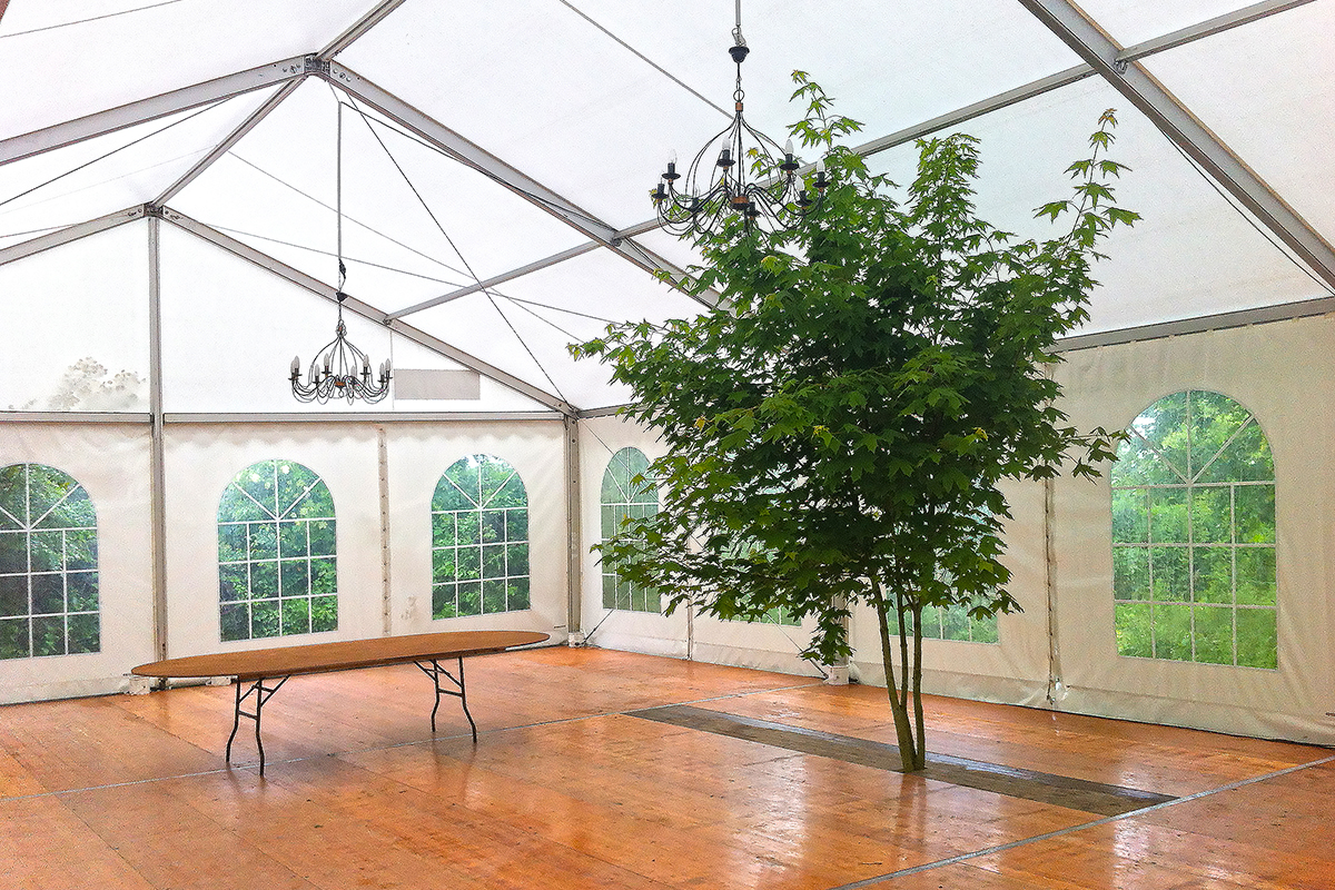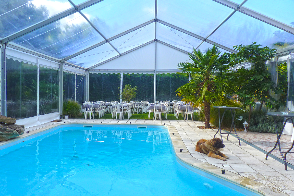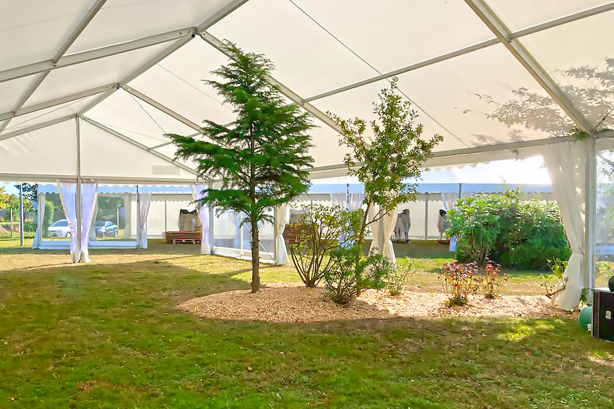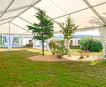 - ■ Intégration d'éléments existants :Il arrive parfois que la structure soit positionnée à un endroit avec une ou plusieurs contraintes. Notre équipe peux intégrer ces éléments dans le chapiteau : arbres, plantes, piscines, fontaines...